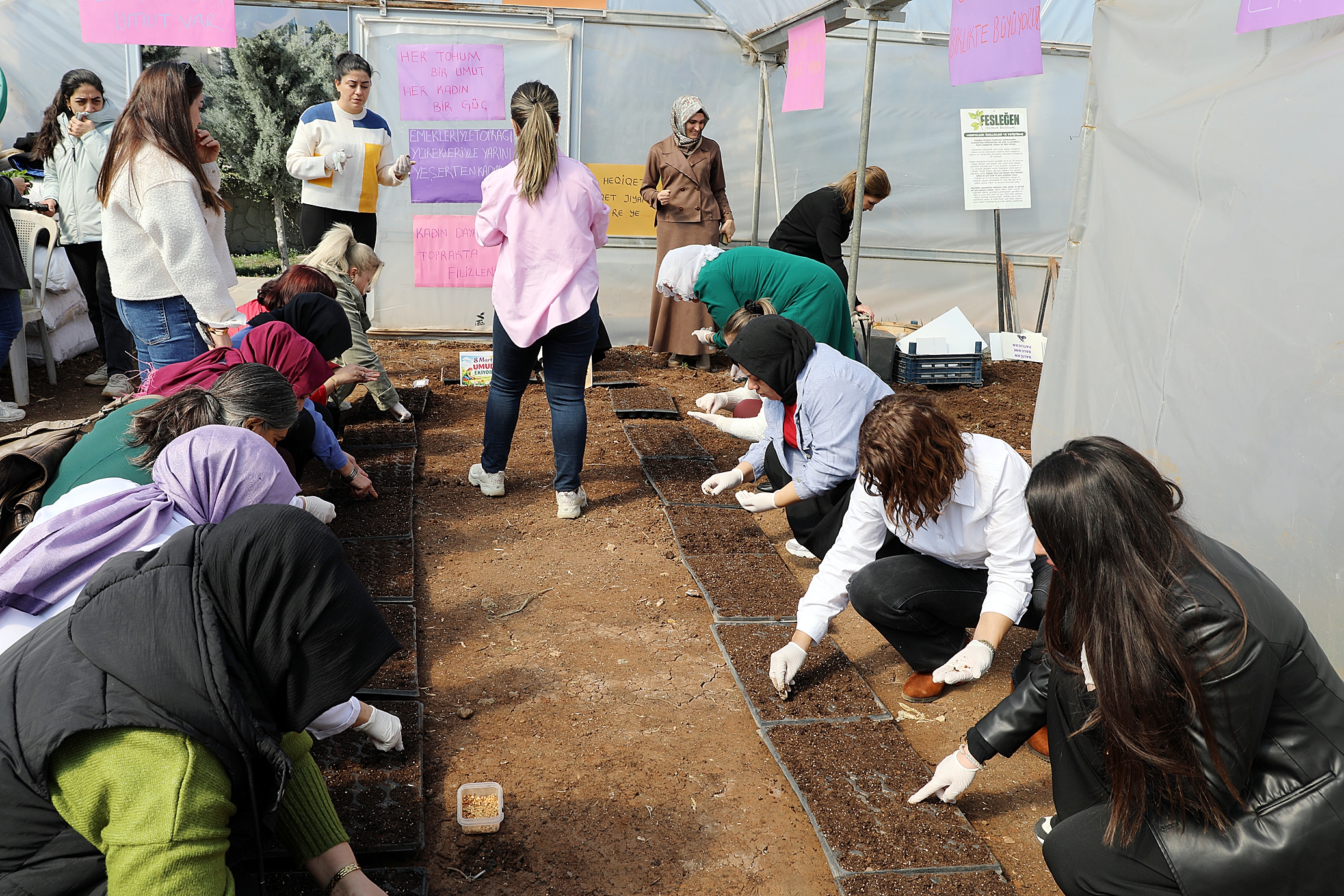 Kadınlar, yerel tohumları seradaki viyollere ekerek fide üretimi için ilk adımı attı.Ekim işleminin ardından tohumların filizlenmesi için can suyu verildi.