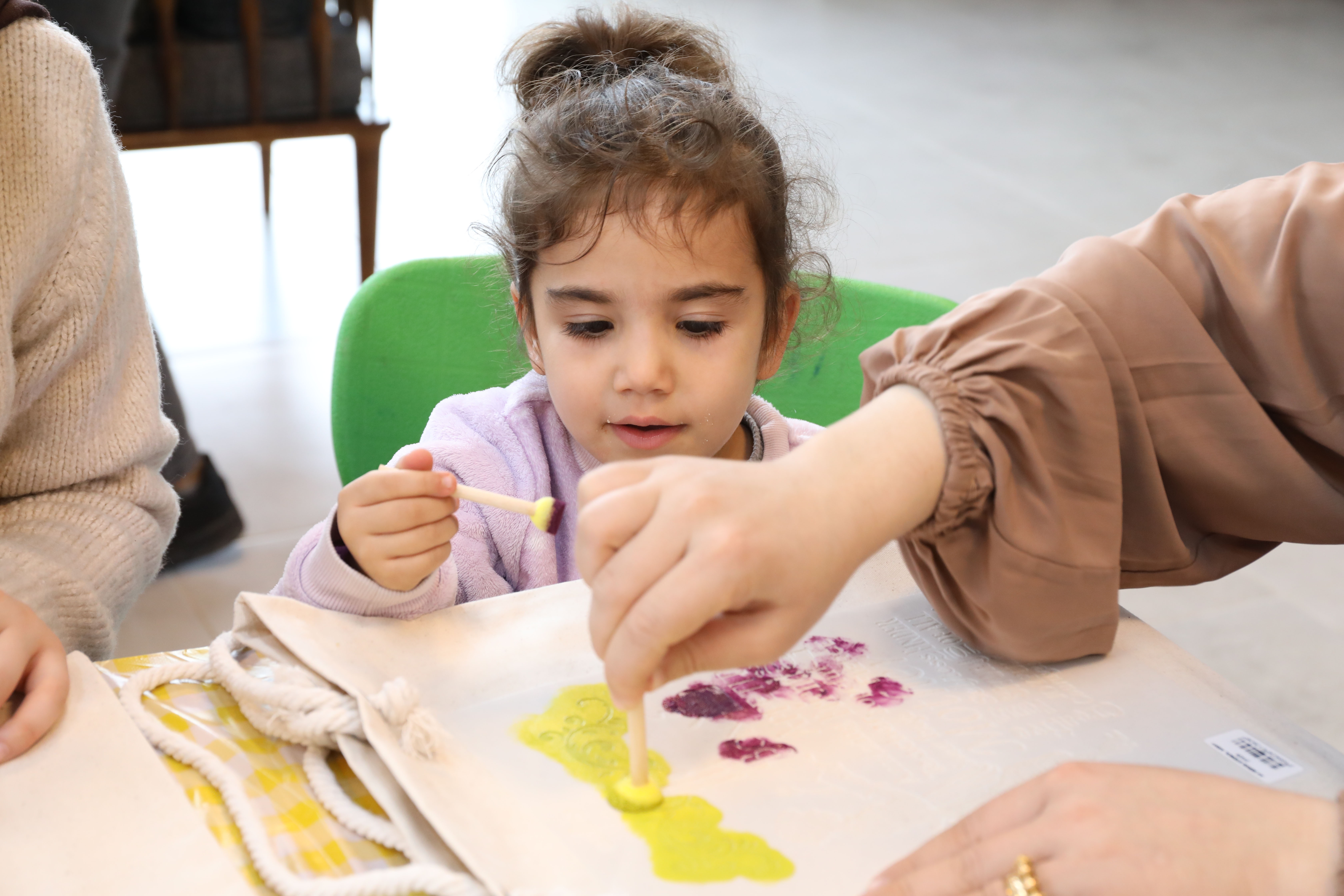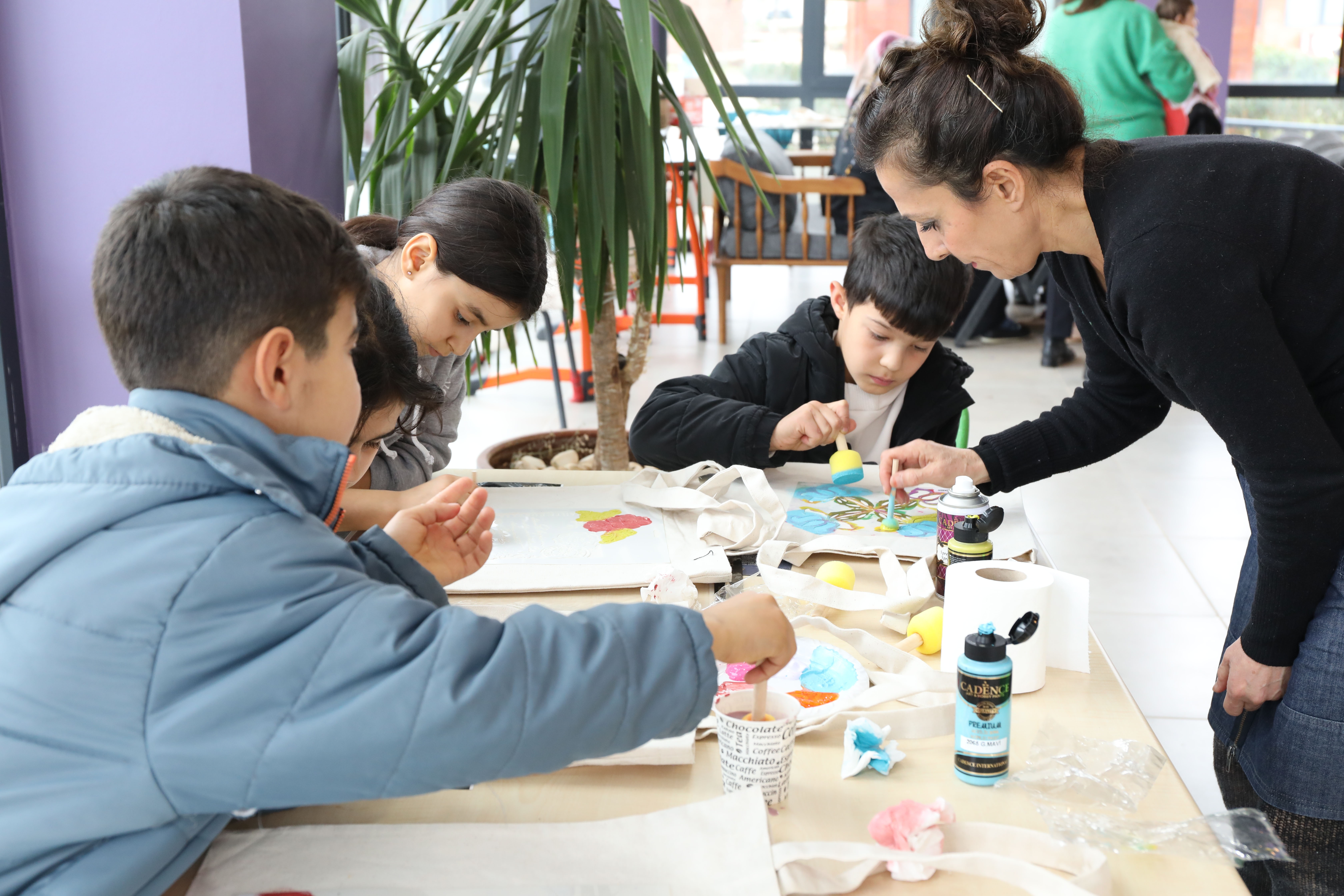 Kadınların çocuklarıyla katıldığı atölyede, eğitmenler tarafından uygulamalı olarak çanta boyama eğitimi verildi.